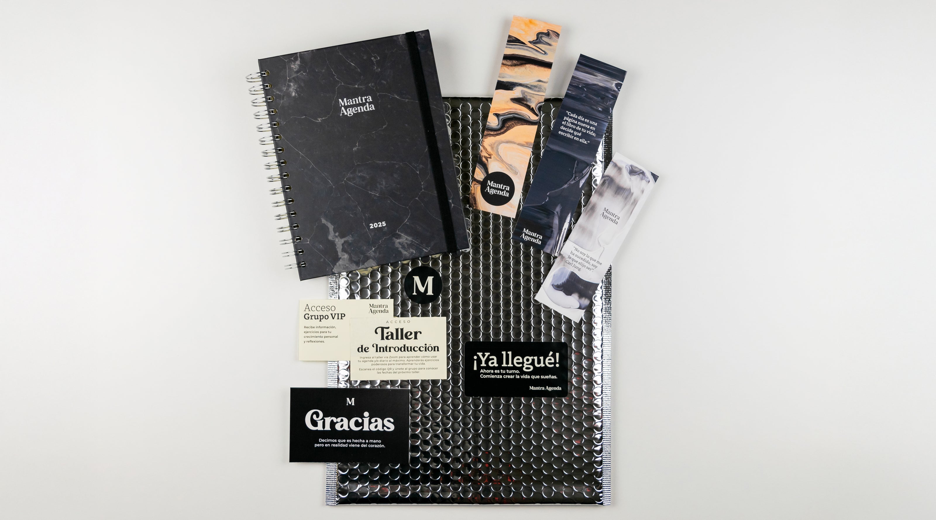 Recibes tu Mantra Agenda en un sobre de plástico metalizado que puedes reutilizar para guardar lo que tu quieras.